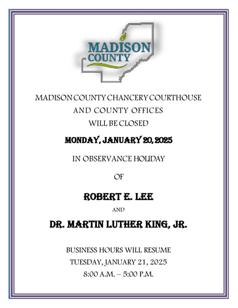 “Madison County Chancery Courthouse and County offices will be clsed Monday, January 20, 2025 in observance holiday of Robert E. Lee and Martin Luther King, Jr. Business hours will resume Tuesday, January 21, 2025 8:00 a.m. – 5:00 p.m.”